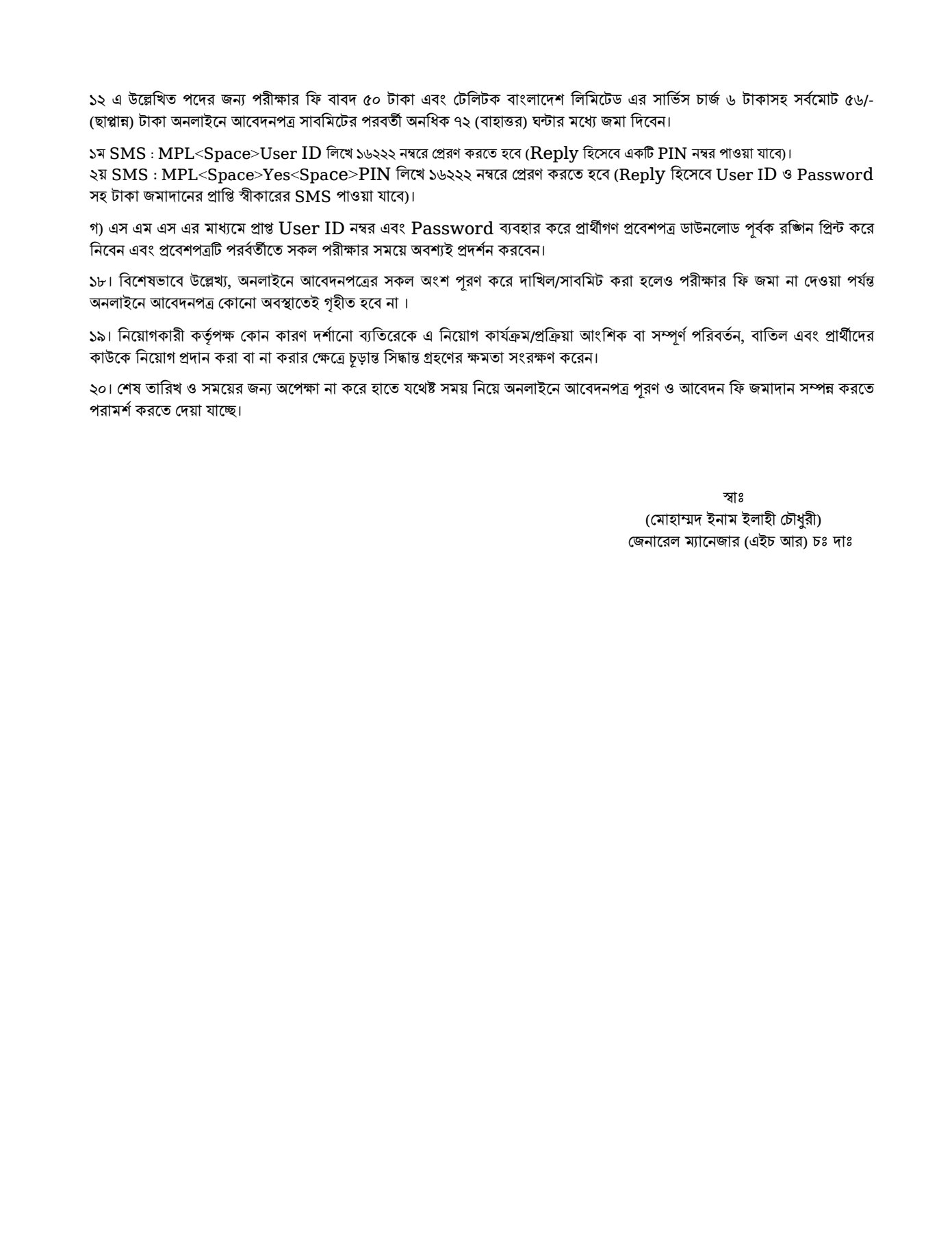 | Application Fee: | 100 & 50 Taka. |